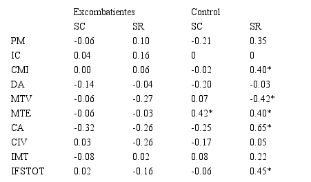 Las correlaciones, en ambos grupos, para la SAC (SR) y el CMI, la MTV, la MTE y el IFSTOT, que fueron bajas y no significativas en el grupo de excombatientes, y las correlaciones moderadas entre el SIC (SC) y la MTE (r: 0,42) en el grupo de controles no combatientes, sugieren que la exposición a eventos traumáticos relacionados con combates en un conflicto irregular, como el caso del colombiano, rompen el enganche entre algunos elementos del funcionamiento ejecutivo.