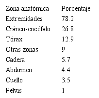 Las extremidades comprenden las zonas corporales de mayor compromiso en los accidentes, con un resultado del 78,2%, seguidas por el cráneo y la cara (26.8%). Entre las regiones anatómicas con menos lesiones esta la pelvis (1%). Las demás partes del cuerpo se muestran en la Tabla 2. En lo atinente a las características clínicas según los signos vitales, el hallazgo inicial más frecuente fue la taquicardia (32.3%) y la taquipnea (19.1%), la hipotensión solo se presentó en el 0.6% de los pacientes. La mortalidad en la escena fue del 0.05%.