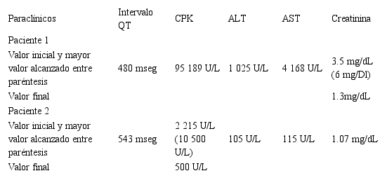 Durante el abordaje inicial se solicitan un electrocardiograma, que muestra prolongación del intervalo QT, y pruebas de química sanguínea, que evidencian elevación de enzimas hepáticas e insuficiencia renal (Tabla 1).