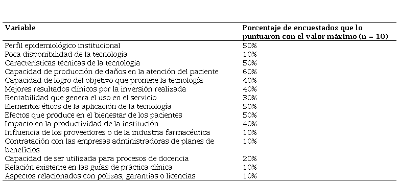Results: 60% of the respondents gave the maximum importance to the capacity to produce damages in the care of patients, 90% consider the criteria of clinical, ethical, and legal safety; and 100% do it with the evaluation of cost effectiveness. In relation to the order of relevance for decision-making in the acquisition of new health technologies, it was evidenced that the institutional epidemiological profile had a higher rating.