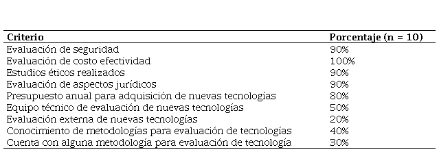 Conclusions: The surveyed health institutions have established protocols in the evaluation of new health technologies. Likewise, the issues that are given the highest priority were identified, such as the issue of harm to patient care, clinical safety, ethical and legal aspects, and cost-effectiveness evaluation.