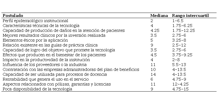 En cuanto al orden de relevancia para la toma de decisiones en la adquisición de nuevas tecnologías en salud, se evidenció que el perfil epidemiológico institucional tuvo mayor calificación con una mediana de 2 (rango intercuartil o RIQ 1–6.25), seguido de mejores resultados clínicos por la inversión realizada y de capacidad de logro del objetivo que promete la tecnología, con una mediana de 3.5 cada una. En la Tabla 3 se muestra la mediana y el rango intercuartil de cada uno de los postulados según fueron puntuados por cada participante.
