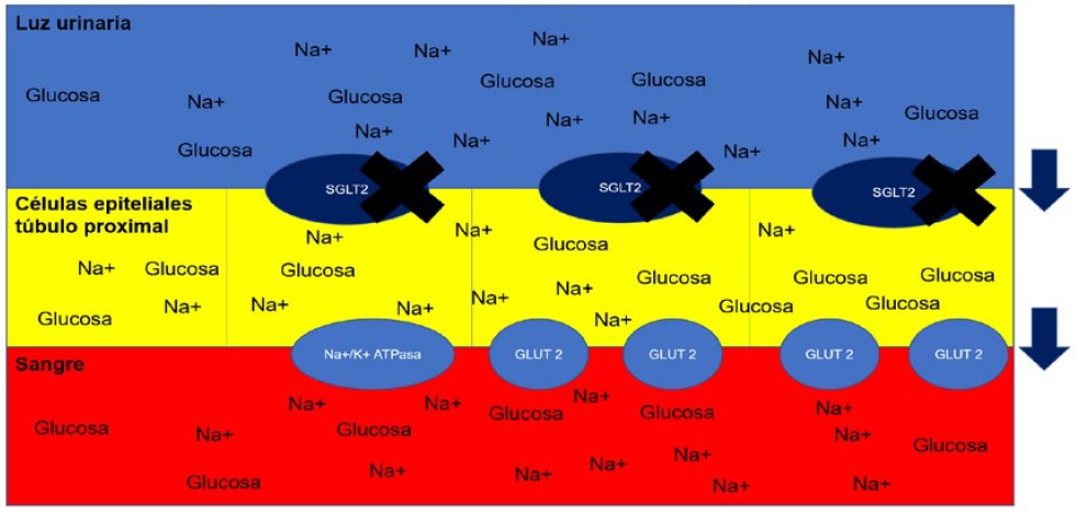 En los pacientes con DM tipo 2 se observa una sobreexpresión al cotransportador de sodio y glucosa tipo 2SGLT2, lo que tiene que ver con el incremento de los niveles de glucosa en sangre. Debido a esto, los iniciadores del cotransportador (i-SGLT2) representan una estrategia terapéutica prometedora en el paciente diabético, ya que al inhibir los SGLT2, responsables de cerca del 90% de la reabsorción de glucosa filtrada por el glomérulo, se induce glucosuria y natriuresis, con eficaz control glucémico6,7. Es importante tener presente que los i-SGLT2 actúan independiente de la insulina y su acción es directamente proporcional a la tasa de filtración glomerular.