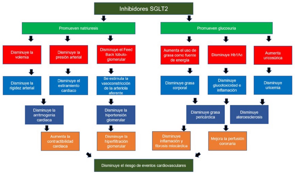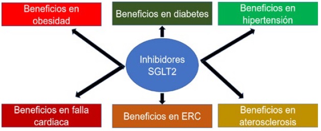 Hasta hace poco se tenía el único conocimiento de que los i-SGLT2 ayudan al control glicémico en pacientes con dm tipo 2 y que se caracterizan por bajo riesgo de generar hipoglicemias, pero incrementan el riesgo de infección urinaria19 y en algunos casos, de cetoacidosis diabética. En los últimos años, se ha visto que al dar un i-SGLT2 se producen efectos metabólicos más complejos que su efecto glucosúrico, y son estos efectos los que han generado gran interés clínico20,21.