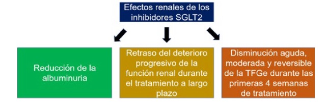 Los i-SGLT-2 aumentan la llegada de sodio a la macula densa. en el aparato yuxtaglomerular lo que luego causa vasoconstricción de la arteriola aferente y disminuye la presión intraglomerular. Esto conlleva a reducción de la hiperfiltración glomerular9,11. Al inicio de la enfermedad renal, las arteriolas aferentes suelen estar dilatadas y las eferentes en vasoconstricción12, generando el fenómeno de hiperfiltración glomerular o hipertensión intraglomerular13; por tal motivo, la administración de i-SGLT2 se ha venido incorporando en el manejo de la enfermedad renal. También, algunos estudios, han demostrado hipoxia renal en pacientes diabéticos debido a la demanda metabólica; los i-SGLT-2 reducen este consumo de energía13.