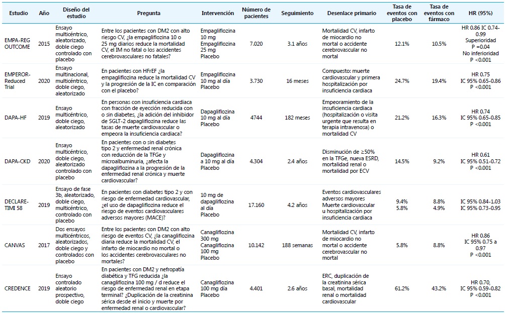 En el año 2019 se realizó el estudio credence de evaluación de los efectos renales y cardiovasculares de canagliflozina en participantes con nefropatía diabética. De la misma manera que los estudios anteriores, también el grupo de que recibía canagliflozina tuvo un menor riesgo de muerte cardiovascular, infarto de miocardio o accidente cerebrovascular (índice de riesgo, 0.80; IC del 95% 0.67 a 0.95; p =0.01) y hospitalización por insuficiencia cardiaca (índice de riesgo, 0.61; IC 95% 0.47 a 0.80; p <0.001). Aunque el ensayo se detuvo de manera temprana por temas de seguridad, se logró encontrar también que el riesgo relativo de insuficiencia renal fue un 30% menor en el grupo de canagliflozina que en el grupo de placebo, con tasas de eventos de 43,2 y 61,2 por 1000 pacientes-año, respectivamente (índice de riesgo, 0.70; IC 95%, 0.59 a 0.82; p <0,001). El riesgo relativo de enfermedad renal en etapa terminal, una duplicación del nivel de creatinina o muerte por causas renales fue menor en un 34% (índice de riesgo, 0.66; IC 95% 0.53 a 0.81; p <0.001), y el riesgo relativo de enfermedad renal en etapa terminal fue menor en un 32% (índice de riesgo, 0.68; IC 95% 0.54 a 0.86; p =0.002)25,38. En la Tabla 2 aparecen los estudios clínicos sobre SGLT2