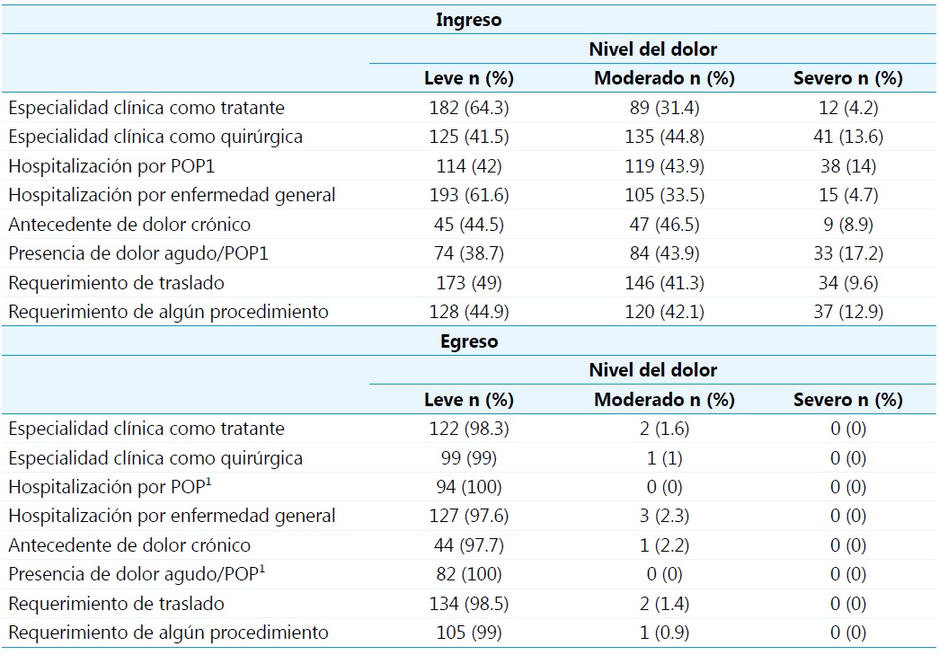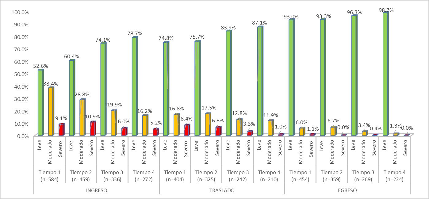 En la Figura 1 se evidencia la evolución del dolor a lo largo de la hospitalización, donde se muestra con frecuencias cuántos presentaban dolor leve, moderado y severo, al ingreso (medido en 4 tiempos), en caso de traslado (medido en 4 tiempos), y al egreso (medido en 4 tiempos). Al egreso hubo 1.3% de pacientes con dolor moderado y severo, logrando un adecuado control del dolor durante la hospitalización. Por otro lado, en la Tabla 3 se muestra cómo fue el comportamiento del dolor en la primera toma al ingreso versus la última toma previo al egreso, discriminado en algunos subgrupos de pacientes.