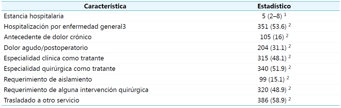 Resultados: se incluyeron 655 pacientes hospitalizados que cumplieron criterios de elegibilidad, con una edad promedio de 53.9 años. La mediana de días de estancia hospitalaria fue de 5 (RIQ 2–8). El número de tomas del dolor en relación con el número de tomas de signos vitales es de 1:4. Los pacientes recibieron entre 2 y 6 medicamentos diferentes para el control del dolor, siendo la dipirona, con el 68.5%, la más utilizada. Al egreso casi la totalidad de los pacientes presentó un adecuado control del dolor.