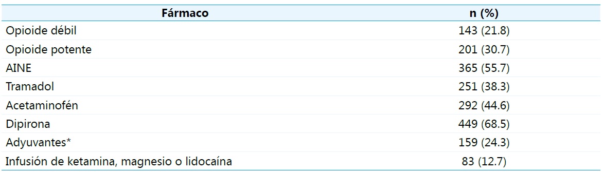 Los pacientes recibieron entre 2 y 6 medicamentos diferentes para el control del dolor. La frecuencia de uso de los principales analgésicos se muestra en la Tabla 2. 55 (8.4%) requirieron evaluación por clínica del dolor y 36 (5.5%), intervencionismo analgésico.