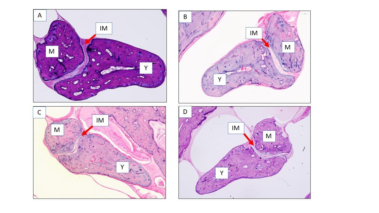 En los cortes horizontales del espécimen se observó en el yunque y estapedio una disminución cualitativa del hueso, siendo evidente en el área distal del yunque y de las cruras del estapedio, comparado con un control de la misma edad sin presencia de osteoporosis (Figura 2A y 2B). Dentro de la evaluación de estructuras en el oído interno, se encontró pérdida de células ciliadas externas en el órgano de Corti. No obstante, otras estructuras como la estría vascular, ligamento espiral y las neuronas ganglionares se observaron sin alteraciones anatómicas.