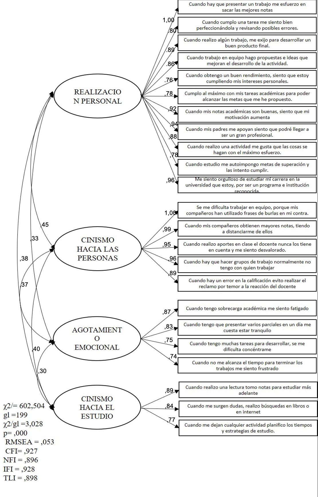 El índice KMO fue de 0.904 y la prueba de esfericidad de Bartlett fue de (X.[5699, n =655] =276; p >0.001). Así se definió la conveniencia de realizar el AFE. Por otro lado, se analizó un modelo que explica de forma teórica el instrumento, el cual varía en función del número, correlación o independencia de los factores. El análisis mostró un modelo de cuatro factores: (a) agotamiento emocional, (b) cinismo hacia el estudio, (c) cinismo hacia las personas y (d) realización personal. El CBA-24 mostró un buen ajuste estadístico que permite contar con una adecuada explicación del modelo teórico.