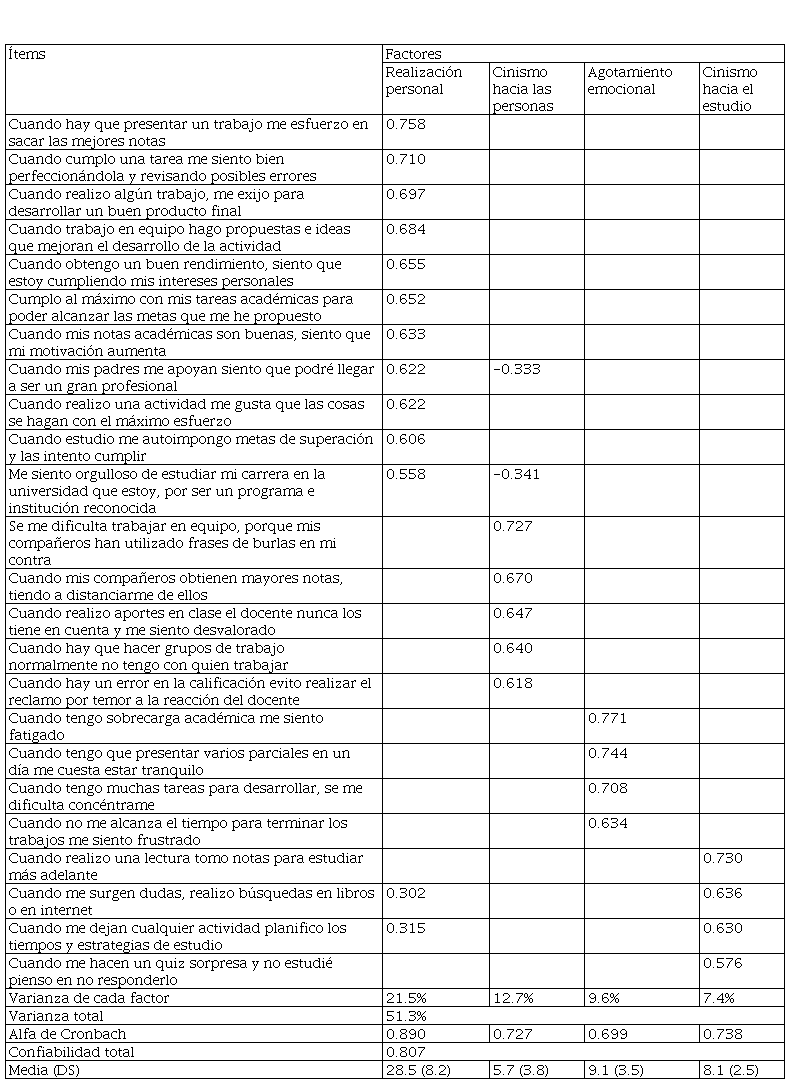 Los 24 ítems que componen el modelo teórico identificado, para el CBA-24, se agruparon en cuatro factores. La Tabla 1 muestra las cargas factoriales y la varianza explicada para cada factor que conforma el instrumento. El CBA-24 explicó una varianza total de 51.3 %, el factor de realización personal quedó conformado por 11 reactivos y explicó el 21.5 % de la varianza; el factor de cinismo hacia las personas quedó conformado por cinco reactivos y explicó el 12.7 %; el factor de agotamiento emocional lo conforman cuatro reactivos y explicó un 9.6 % de la varianza; y el factor de cinismo hacia el estudio quedó conformado por cuatro reactivos y explicó el 7.4 %.