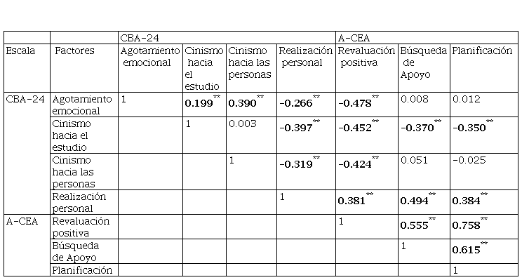 En la Tabla 2 se describen los coeficientes de correlación Pearson entre los factores que conforman el CBA-24 y la A-CEA. Se encontraron factores que correlacionan de manera significativa. Además, se halló una correlación entre las cuatro escalas que forman el CBA-24. En cuanto a las correlaciones entre los cuatro factores del CBA-24 (agotamiento emocional, cinismo hacia el estudio, cinismo hacia las personas y realización personal) y los tres del A-CEA (reevaluación positiva; búsqueda de apoyo y planificación), el agotamiento emocional se correlacionó de forma inversa con la reevaluación positiva. Sin embargo, no se encontró relación entre el agotamiento emocional y los factores búsqueda de apoyo y planificación. El cinismo hacia el estudio tuvo correlación inversa con los tres factores que conforman el A-CEA. El factor cinismo hacia las personas solo se correlacionó de modo inverso con el factor de revaluación positiva. Finalmente, la realización personal correlacionó de modo directo con los tres factores que conforman el A-CEA (Tabla 2).