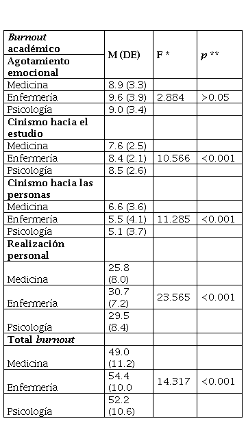 De manera análoga, se encontró una diferencia significativa en el factor de realización personal, en el que los estudiantes de enfermería fueron los que obtuvieron mayor puntuación promedio, a comparación con los de medicina y psicología. Esto podría indicar que perciben impotencia o poca capacidad para afrontar con interés las tareas o las demandas académicas (Tabla 3).