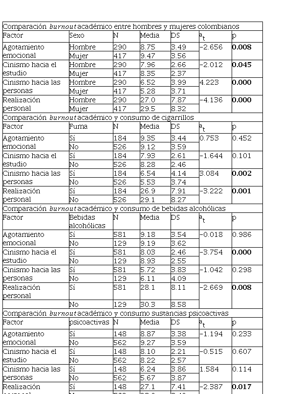 Nteveros et al79 encontraron diferencias en las dimensiones del agotamiento entre estudiantes de medicina consumidores y no consumidores de alcohol. Los autores encontraron más cinismo y menos sentimientos de eficacia. Así mismo, Jackson et al80 hallaron que los estudiantes norteamericanos con diagnóstico de abuso/dependencia del alcohol reportaron altos niveles de BA, depresión, baja calidad de vida mental y emocional. Los dominios de agotamiento emocional y despersonalización del BA se asociaron con el abuso/dependencia del alcohol, en especial para los estudiantes más jóvenes, solteros y con deuda educativa.