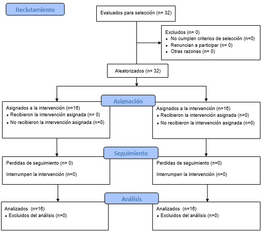 Participaron 32 sujetos ([media ± de] edad, dinámico 23.13±2.0, FNP 22.63±1.09), 25 mujeres sanas (78.12 %) y siete hombres sanos (21.87 %), con un rango de edad de 20 a 30 años con una media de 22.87 años, de lateralidad diestra, n = 30, 93.75 % y zurda, n = 2, 6.25 %. Los participantes fueron informados personalmente sobre el procedimiento. Se excluyeron aquellos con antecedentes de lesiones en miembro inferior dominante (Figura 1). Todos los participantes fueron informados de la intervención a realizar, además de los beneficios y riesgos. Cada uno dio el consentimiento informado por escrito para su participación. El presente estudio tuvo en cuenta los lineamientos de la resolución 8430 de 1993, clasificada en la categoría investigación con riesgo mínimo. En todas las fases de la investigación se mantuvo la beneficencia, no la maleficencia. El trabajo de investigación fue aprobado y avalado por el Comité de Ética e impacto ambiental de la Universidad de Pamplona, según el acta 07 del 15 de junio de 2022.