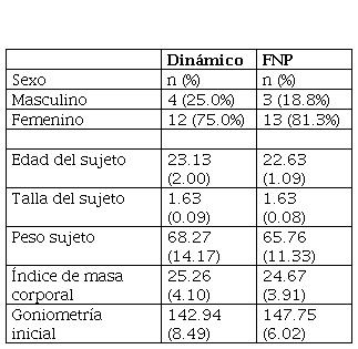 De los 32 adultos jóvenes, 16 fueron asignados al estiramiento FNP y 16 al de estiramiento dinámico. La edad promedio para el grupo en FNP fue de 22.63±1.09, en el dinámico de 23.13±2.0. En el FNP, el 81.3 % de participantes eran de sexo femenino y 75.0 % en el grupo de estiramiento dinámico. En la Tabla 1 se muestran las características de la línea de base.