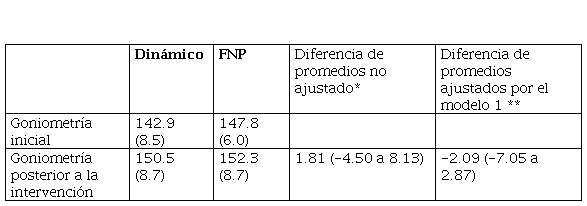 Resultados: los resultados de las medias edad, peso, talla e índice masa corporal son equivalentes, lo que indica grupos comparables entre sí. No se hallaron diferencias entre los grupos de estiramiento en los promedios ajustados -2.09 (IC95% -7.05 a 2.87)