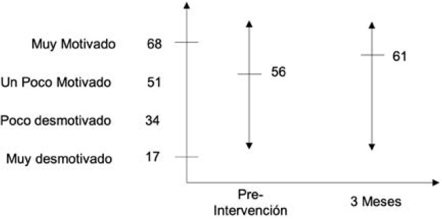 En nuestro estudio la motivación hacía el aumento del EF se vio mejorada a los tres meses de la intervención. Partiendo de que atravesar por las consecutivas etapas de cambio de conducta puede implicar largo tiempo35, sería importante prolongar el acompañamiento al PS.