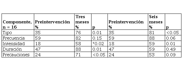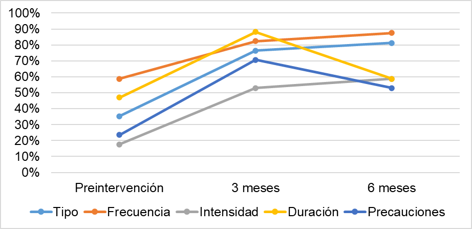 En cuanto a la prescripción de EF, hubo un aumento en los componentes de la prescripción después de finalizada la intervención, como se observa en la Figura 2. El aumento fue significativo (p <0.05) en la mayoría de las componentes después de tres meses de la intervención, con excepción del componente frecuencia. Después de seis meses, ese incremento solo fue estadísticamente significativo (p <0.05) en los componentes tipo e intensidad (Tabla 4).