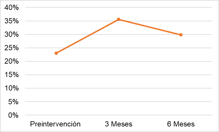 Respecto al peso de los participantes, se encontró que antes de la intervención, el 47 % tenía sobrepeso (IMC 25–29.9 kg/m.), mientras que el 17.6 % tenía obesidad (IMC >30 Kg/m.). Hubo una disminución del peso después de la intervención, la mediana previa fue de 72 kg (63-79), a los tres meses de 70 kg (62-76) y a los seis meses de 69.5 kg (64.2–78). El IMC tuvo un comportamiento similar, antes de la intervención la mediana de 26.8 (24–28.6), a los tres meses fue de 26.4 (23.9–29.6) y a los seis meses de 26.6 (24.5–28.7).