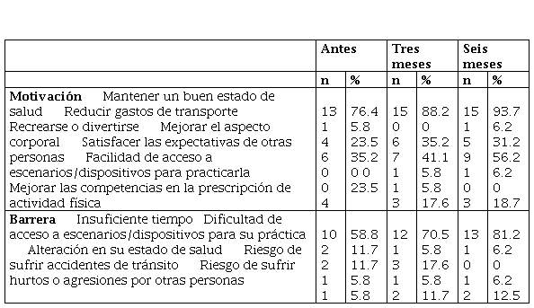 En la Tabla 3 se observan las principales motivaciones y barreras referidas por los participantes, antes y después de la intervención.