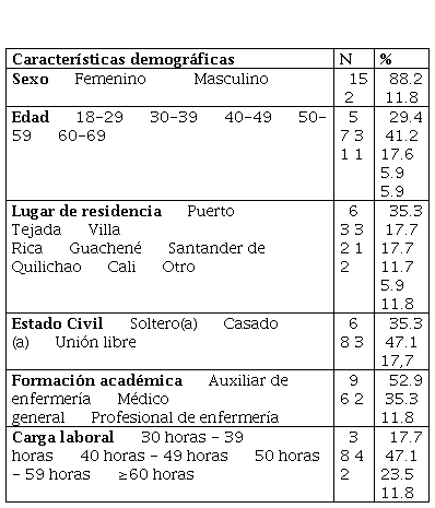 De los 17 profesionales que participaron, 16 completaron las 3 mediciones. Solo una persona no se evaluó para el tercer periodo, porque dejó de laborar en la institución antes de la evaluación a los seis meses. La Tabla 1 presenta las características demográficas del PS y la Tabla 2 las de los pacientes cuyas historias clínicas fueron revisadas.