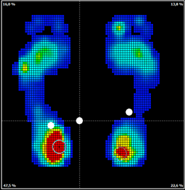 During examination, the patient stands on the platform in two positions (ecosanit foot). Position 1: anatomical position with the feet apart at shoulder width. Position 2: anatomical position with feet together. The following parameters were included for test analysis: