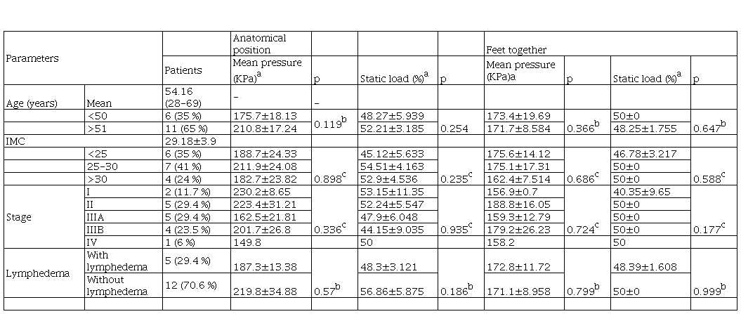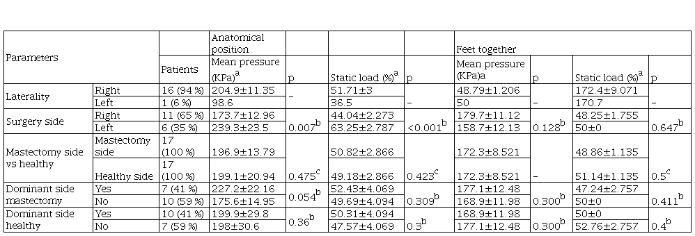 Methodology: a descriptive correlational research was carried out. Foot weight-bearing properties were identified in 17 patients who have undergone a mastectomy. An Ecosanit Foot pressure plate was used to measure foot load at anatomical position and keeping the feet together.