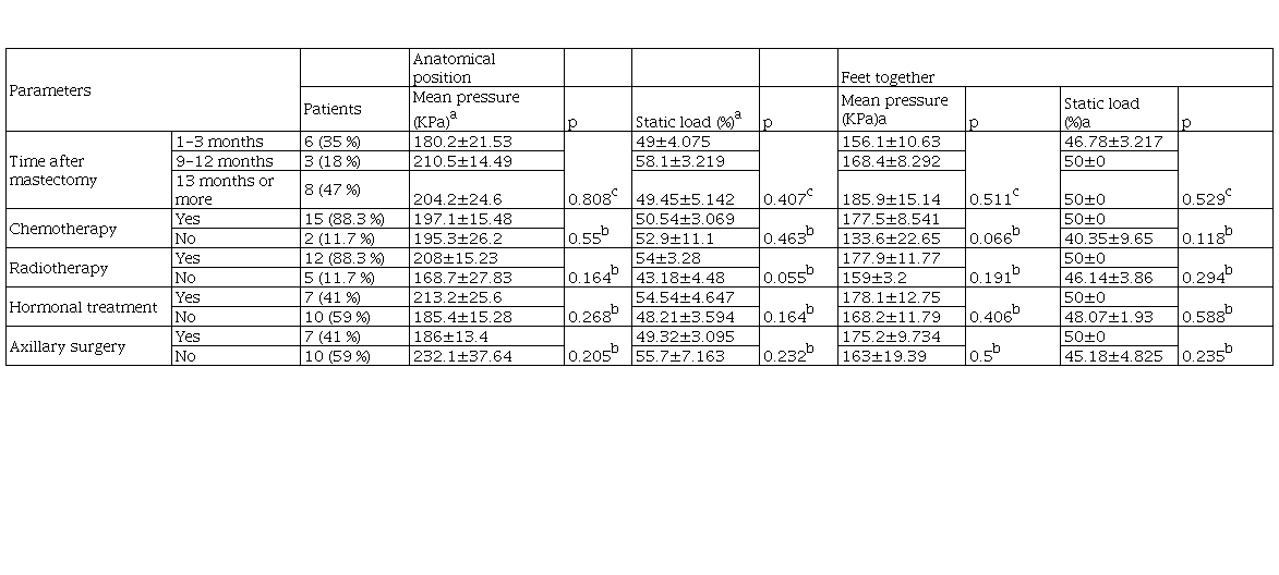 The table 2 provides a summary of the parameters reflecting static load and mean pressure at anatomical position and with feet together in relation to the oncological treatment received. Patients who received radiotherapy showed a higher mean pressure and statistically significant difference in the static load at anatomical position compared to those subjects who did not receive that treatment (p= 0.055).