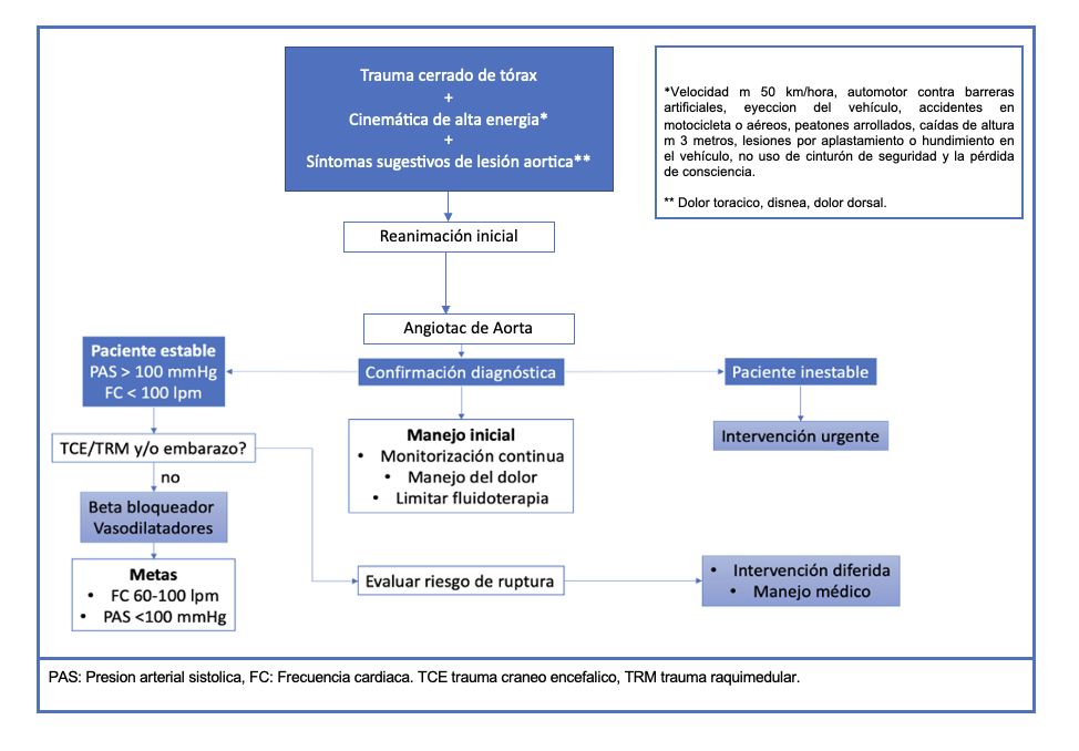 Abstract: Trauma is the leading cause of death in the productive-age population. Addressing blunt chest trauma is still a challenge for the emergency physician. Although it is not a common entity, it is associated with high mortality and adverse outcomes. The diagnosis of blunt thoracic aortic trauma (LCAT) requires a high index of suspicion, given that the signs and symptoms are not specific to this disease (chest pain, interscapular pain, dyspnea, dysphagia, stridor, dysphonia). It is important to highlight that the absence of hemodynamic instability should not rule out aortic injury. For its imaging diagnosis, it must be taken into account that chest X-rays do not have adequate performance; the reference standard is angiotomography and transesophageal echocardiography (TEE) is a diagnostic option. Management includes intravenous fluids and antihypertensives as a temporary measure, definitive surgical management and, in some cases, expectant or deferred management. Unstable patients or patients with signs of imminent rupture should be taken immediately to surgery. Early surgical management has impacted mortality. Despite advances in surgical techniques, the open surgical technique documents a higher mortality rate than endovascular management, which has numerous advantages as it is minimally invasive. This is a narrative review that highlights some key aspects about the mechanisms of injury, diagnosis and initial management of blunt thoracic aortic trauma. Finally, an algorithm for addressing aortic trauma is proposed.