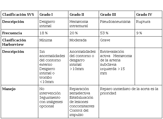 A partir de las imágenes diagnósticas puede clasificarse la lesión y definir un posible abordaje. En la literatura se describen dos clasificaciones para la lesión cerrada de aorta torácica, entre ellas: la clasificación de la sociedad de cirugía vascular (SVS, por sus siglas en inglés) y Harborview, como se describe en la tabla 1 con su respectiva frecuencia de presentación24,25.