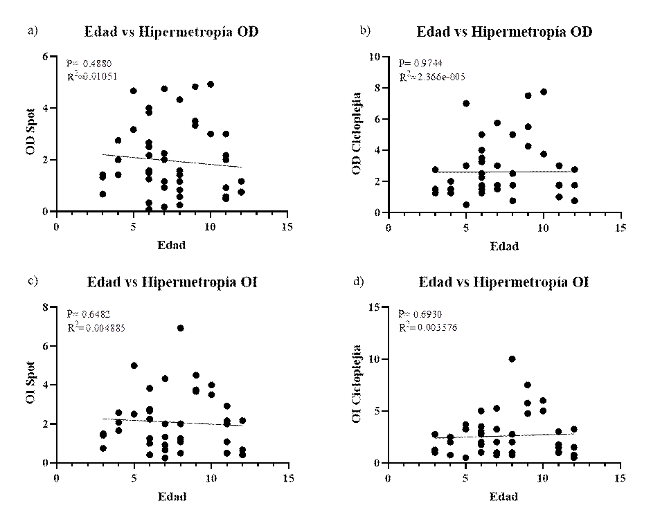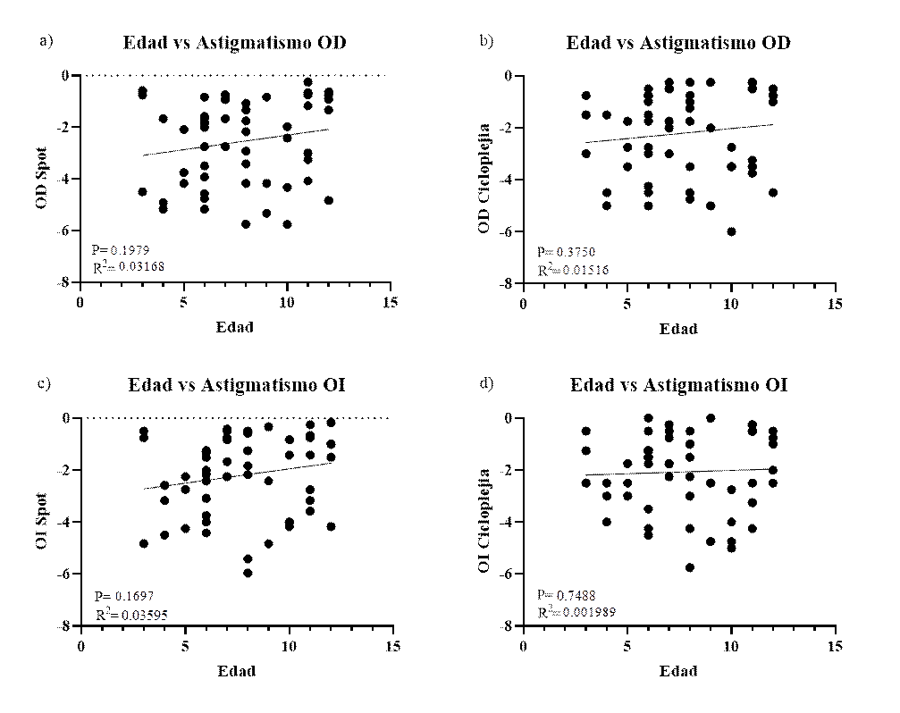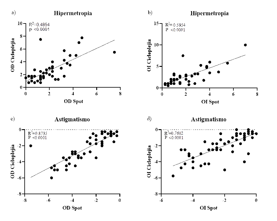 En cuanto a las correlaciones que tiene en cuenta un único valor por Spot Vision Screener y la retinoscopía bajo cicloplejia, se mantiene la correlación positiva para todos los defectos de la visión en ambos ojos. Sin embargo, para la hipermetropía del ojo derecho disminuye la magnitud de la correlación del 67 % (figura 2a) al 48 % (R2=squared 0.4854). Aun así, demuestra una correlación significativa (p<0.0001) (figura 6a). Con respecto a la hipermetropía en ojo izquierdo, también se observa la reducción en la magnitud de la correlación del 69 % (figura 2b) al 59 % (R2=0.5954), todavía manifiesta una correlación significativa (p<0.0001) (figura 6b). Frente al astigmatismo para ojo derecho, la magnitud de la correlación aumenta al 87 % (R squared 0.8735), evidencia una correlación significativa (p<0.0001) (figura 6c) (figura 2c-d) y para el ojo izquierdo la correlación mejora (R squared 0.7602), hay una correlación significativa (p<0.0001) (figura 6d).