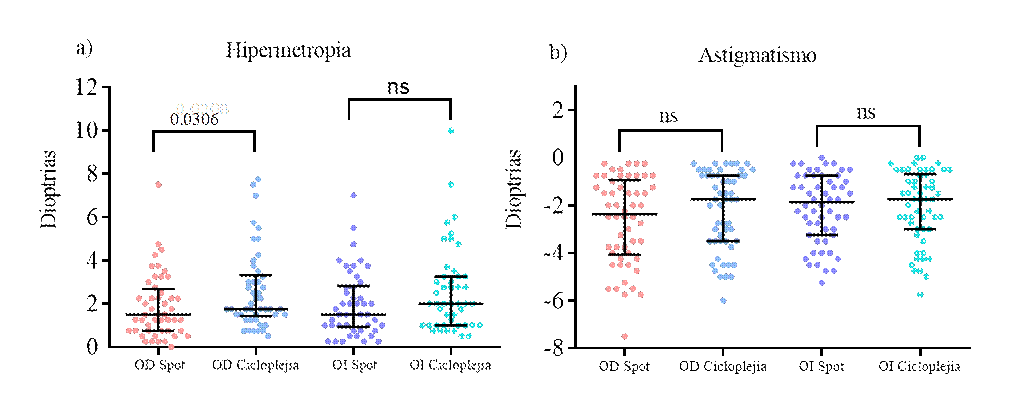 Seguido, se evaluó si la comparación entre las mediciones con los dos sistemas cambia si en vez de tomarse el promedio de 3 mediciones en el Spot Vision solo se usa la primera medición. Como se muestra en la figura 5a, para el error refractivo de hipermetropía en ojo derecho hay variaciones significativas entre los dos sistemas, lo cual afecta la concordancia en la medición de este defecto refractivo (p=0.0306). Con respecto a las demás comparaciones, no existen diferencias significativas para el defecto de hipermetropía en ojo izquierdo (figura 5a) ni con respecto al astigmatismo (figura 5b).