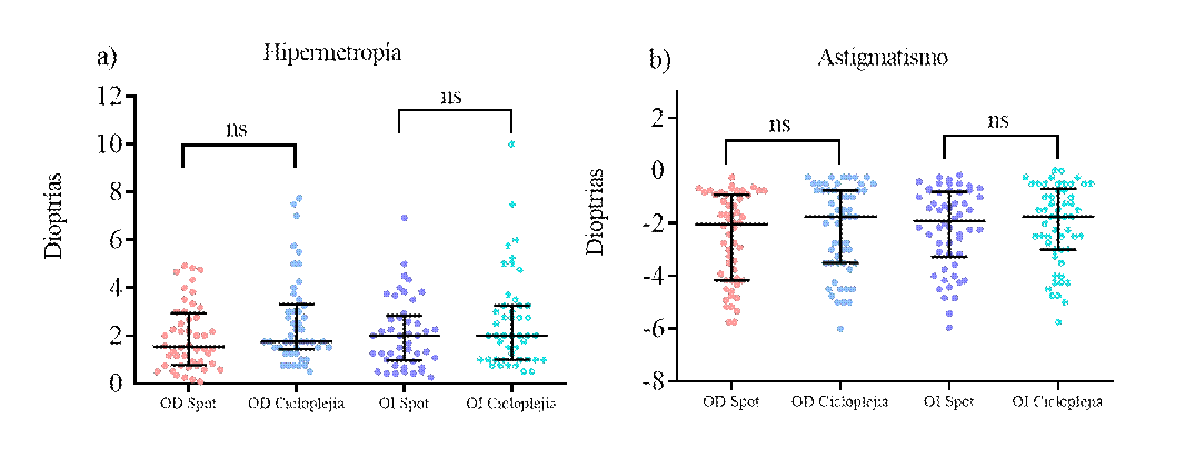 Results: it was found that there aren’t statistically or clinically significant differences between the median values measured with the Spot Vision Screener and those obtained through retinoscopy under cycloplegia for each type of refractive error, including hyperopia RE (p=0.060) OI (p=0.907), astigmatism RE (p=0.173) LE (p=0.696) and myopia RE (p=0.699) LE (p=0.918). Likewise, we observed that the average of three measurements with the Spot Vision Screener significantly improved the measurement agreement (p=0.0306).