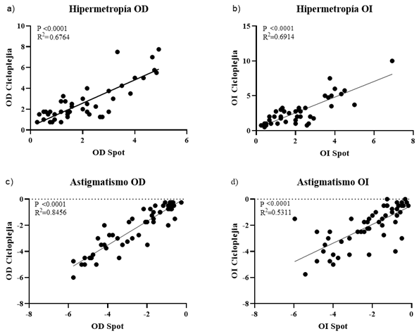 La correlación estadística con Spearman entre retinoscopía bajo cicloplejia y el promedio obtenido con el Spot Vision Screener para medir el defecto refractivo hipermetropía del ojo derecho es del 67 % (R.=0.6764), lo que comprueba una correlación positiva y significativa (p=0.0001) (figura 2a). En cuanto al ojo izquierdo, se evidencia que la magnitud de la correlación es del 69 % (R.=squared 0.6914), es igualmente positiva y significativa (p=0.0001) (figura 2b). Frente a la correlación entre la retinoscopía bajo cicloplejia y el Spot Vision Screener para medir el cilindro, en el ojo derecho fue del 84 % (R.=0.8456), confirma una correlación altamente positiva y significativa (p=0.0001) (figura 2c), mientras que para el ojo izquierdo la magnitud de la correlación es del 53 % (R.=0.5311), es una correlación positiva aceptable y significativa (p=0.0001) (figura 2d).