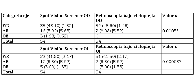 En relación con el eje del cilindro, se evaluó a partir de las frecuencias en las categorías y con la prueba chi cuadrado. Se demostró que las variables no estaban asociadas, es decir, son dependientes, esto evidenció las diferencias entre la media del eje del cilindro con el Spot Vision Screener con respecto a la retinoscopía bajo cicloplejia para ojo derecho y ojo izquierdo. La mayoría de la población presentó astigmatismo WR con el Spot Vision (43.10) y la retinoscopía bajo cicloplejia (43.90), seguido del cilindro AR Spot Vision (8.92) y la retinoscopía bajo cicloplejia (5.52), como se muestran en la tabla 1.
