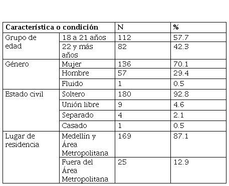 De los 194 participantes, el 70 % fueron mujeres y alrededor del 58.0 % tenía entre 18 y 21 años. El promedio de edad fue 21.8 años (DE 2.97). La mayoría eran solteros (92.8 %) y aunque el 87.1 % (169) reportaron vivir en Medellín y el Área Metropolitana, 13 de cada 100 estudiantes vivían fuera de estas zonas geográfica (tabla 1).