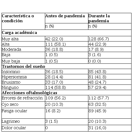 Conclusiones: las afecciones oftalmológicas, el tiempo a exposición en pantallas y la percepción de la carga académica aumentaron durante el periodo de pandemia.