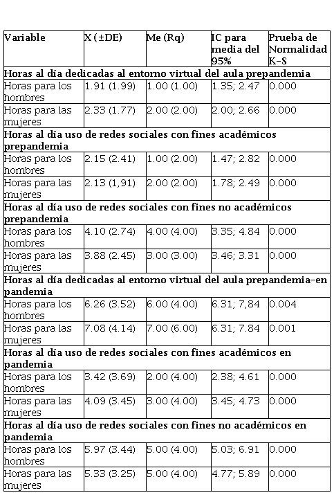 Los anteriores son cambios con un comportamiento diferencial para hombres y mujeres. En lo que tiene que ver con el uso del aula virtual, la mediana de horas al día aumentó de 1 en prepandemia a 6 en pandemia. Para las mujeres, el 50.0 % pasó de 2 a 7 horas al día. Por su parte, la mediana de uso de redes sociales con fines académicos para los hombres fue de 1 hora prepandemia (Me=1.0. Rq=2.0) y 2 horas en pandemia (Me=2.0. Rq=4.0). En cambio, la mitad de las mujeres utilizaban las redes sociales con fines académicos por 2 horas prepandemia (Me=2.0. Rq=2.0) y 3 horas en pandemia (Me=3.0. Rq=4.0) (tabla 3).