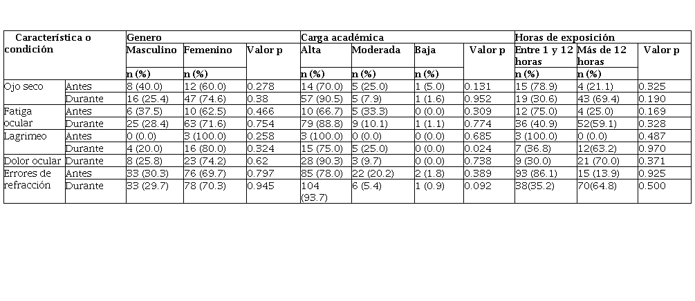 Results: of 194 participants, 70 % were women, 92.8 % single, 87.1 % lived in the Metropolitan area. Refractive errors increased in 1.5 %, sore eye 22.2 %, ocular fatigue 37.7 %, tearing 8.8 % and ocular pain 16 %. During pandemic times all ophthalmologic conditions were more common in women, most people who reported affections also reported high academic burden and more than 12 hours of screen exposure.