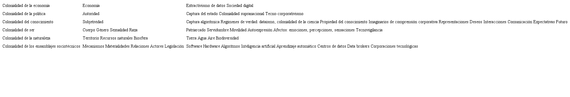 Desde la perspectiva decolonial, a partir de Quijano (2000; 2007) y Mignolo (2014) podríamos intentar replantear la matriz del poder en términos del actual capitalismo cognitivo. Si para Quijano (2000, p. 573) la transformación de la estructura de poder debe entenderse en el sentido de tomar “control sobre trabajo/recursos/productos, sobre sexo/recursos/productos, sobre autoridades/instituciones/violencia, y sobre intersubjetividad/conocimiento/comunicación”, proponemos un marco de referencia para comprender las diversas dimensiones de la colonialidad y sus manifestaciones en esta fase. Este modelo habla de la colonialidad de los ensamblajes sociotécnicos que conforman la infraestructura material y simbólica para la consolidación de la matriz de poder. Como afirma Mignolo, la colonialidad del poder es un conjunto de diversas actividades y formas de control: la colonialidad del conocimiento, el ser y el sentir (2014, p. 17). La matriz de poder perfila nuestras acciones y nuestra racionalidad. Desentrañar sus mecanismos implicaría realizar un ejercicio analítico de sus manifestaciones en el capitalismo cognitivo, del lugar que ocupan en él los ensamblajes sociotécnicos y la producción de subjetividades.