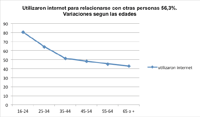 El porcentaje promedio de internautas que accedieron a internet para relacionarse con una o más personas es 56,3%. Las diferencias de edades son las características que sobredeterminan las variaciones significativas de quienes superan o quedan por debajo del porcentaje. Se diferencian tres conjuntos de edades: