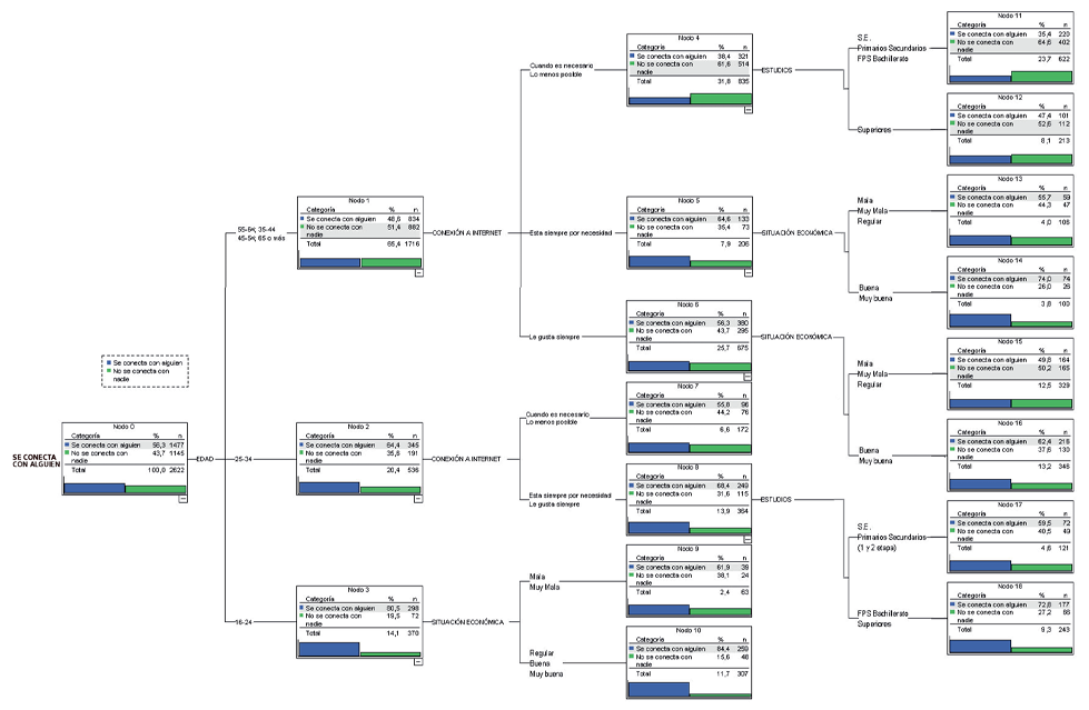 4. Se aplica un análisis de segmentación para el tratamiento estadístico de los datos. Como en la mayoría de las investigaciones, los resultados de la encuesta se cruzan con variables de control. Se comprueba cuáles afectan de forma significativa a los porcentajes de quienes han virtualizado sus interacciones y cuáles no. Es el primer nivel de los análisis realizados.Para el segundo nivel de análisis se parte del supuesto de que la virtualización de las relaciones interpersonales es una mediación tecnológica que implica determinaciones sociales. Para analizar tal supuesto se obtiene el modelo de mediación que corresponde a la forma en la que están operando esas afectaciones. Y se construye dicho modelo aplicando los programas Chaid y Xaid de segmentación3, que identifican las interdependencias que existen entre las afectaciones y las organizan como un sistema. Son algoritmos para la detección automática de interacciones.4 Detectan cuando los efectos de una variable independiente sobre una variable dependiente están determinados por los valores que adopten las categorías de otra variable independiente.
