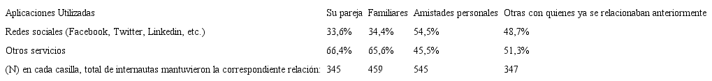 3. Se toman en cuenta todas las aplicaciones que se pueden utilizar para mantener contactos virtuales. Se recogen datos de utilización de las redes sociales −Facebook, Twitter, LinkedIn, etc. Pero los usuarios y usos de las redes sociales, no representan el total de las relaciones interpersonales virtualizadas, como se muestra en la Tabla 1. Para abarcar la virtualización de las relaciones personales también se han tomado en cuenta los restantes servicios a través de los cuales se establecen esos contactos: SMS, e-mail o correo electrónico, Mensajería instantánea −Whatsapp, Hangouts, etc.−, aplicaciones de video-conferencia −Skype o similares− y resto de servicios.