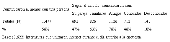 Al parecer, la relación virtual ya está siendo una práctica cotidiana para la mayoría de los internautas, sobre todo cuando los comunicantes son amistades, tal y como se muestra en la Tabla 2. Es un dato que se corresponde con otros estudios6. Con todo, no deja de ser llamativo que la mitad de los internautas recurrieron a internet para interactuar con la pareja. El dato sorprende porque se refiere al vínculo en el que se supone que habría más oportunidades y pertinencia para las relaciones presenciales. En la Tabla 2 se presentan los datos de este apartado.
