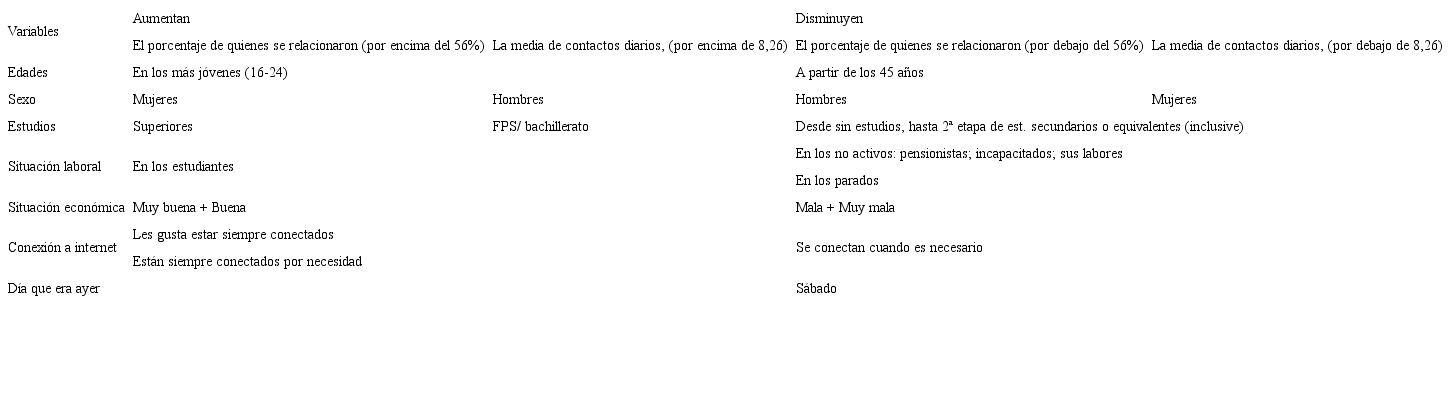 Como se ha indicado, en el conjunto de la muestra, el porcentaje de usuarios es 56% y la media de personas distintas contactadas es de 8,26. Estas cifras aumentan o disminuyen en determinadas tipologías de usuarios, clasificados según las habituales variables sociodemográficas de edad, sexo, nivel de estudios, ocupación y situación económica. También se diferencian los encuestados según la actitud que manifiestan respecto al uso que hacen de internet y según el día en que recurrieron a internet para comunicarse virtualmente. En los resultados obtenidos han aparecido las siguientes variaciones estadísticamente significativas: