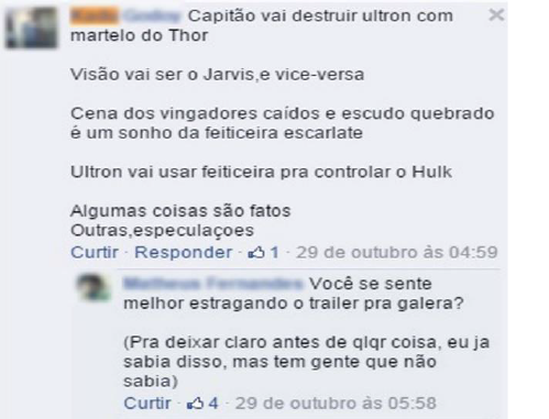 O efeito semântico (Gumbrecht, 2010) do UCM se dá através do fluxo de informações que os fãs geram. Alguns fãs criam sites, blogs, páginas de Facebook, e distribuem notícias do UCM, além de outros assuntos da cultura geek, e outros fãs consomem, compartilham e participam das discussões nessas comunidades, trazendo seu ponto de vista através de seu nível individual de imersão ou especialidade no assunto. É interessante ver que mesmo dentro desses fóruns existe uma espécie de competição para estabelecer quem entende mais sobre a franquia. Observamos que dentro deste campo, o nível de conhecimento e mesmo as teorias pessoais passam a ser uma forma de capital, uma maneira de se relacionar com a franquia. Podemos observar isso, nos exemplos abaixo. Na primeira imagem, a discussão aconteceu quando a Marvel lançou o primeiro trailer de Vingadores: Era de Ultron (2015) na página de Facebook Marvel Brasil. E a segunda trata dos comentários acerca de uma matéria sobre o final de Vingadores: Guerra Infinita (2018) em uma página de cultura pop, Legião dos Heróis.