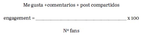 La palabra engagement se traduce como compromiso, es el término utilizado para describir el proceso que permite formar una relación −emocional y racional− entre personas y marcas (Consoli & Musso, 2010, p. 322), por tanto, nos permite valorar la relación que tienen los usuarios con los fanpages turísticos reflejado en su participación en la Red. Para calcular el engagement se aplica la siguiente fórmula que ha sido empleada en diversas investigaciones (Cvijikj & Michahelles, 2013; Valerio, Herrera, Herrera, & Rodríguez, 2014; Martínez-Fernández, Sánchez-Amboage, Mahauad-Burneo, & Altamirano-Benítez, 2015; Altamirano Benítez, Marín-Gutiérrez & Ordóñez González, 2018), lo que corrobora la idoneidad para la aplicación en los estudios de medios sociales.
