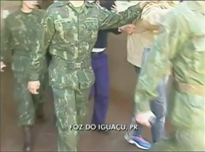 Após a chamada da matéria (Figura 1), os três marinheiros são mostrados sem as fardas, com agasalhos cobrindo seus rostos, e sendo conduzidos por militares fardados, que também não têm seus rostos mostrados, para dentro de um carro que aparenta ser comum, sem ser de nenhuma força de segurança (Figura 2).